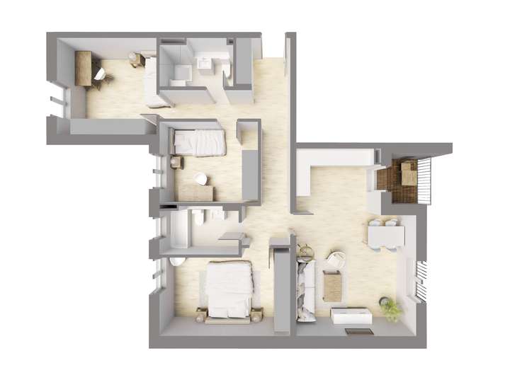 Die moderne 4-Zimmer-Wohnung besticht durch ihre hochwertige Ausstattung und eine durchdachte, funktionale Raumaufteilung. Ein eleganter Boden in Eichenoptik mit integrierter Fußbodenheizung sorgt zusammen mit einem modernen Frischluftsystem und einer angenehmen Raumhöhe von ca. 2,60 m für ein komfortables Wohnambiente. Große Fenster mit 2-fach-Verglasung und Rollläden lassen viel Tageslicht herein und gewährleisten gleichzeitig Ruhe und Privatsphäre.