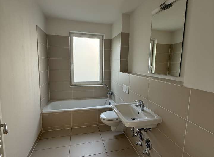 Das großzügige Badezimmer verfügt über eine Badewanne, edle Feinsteinzeugfliesen und geschmackvolle Sanitärkeramik. Ein separates Gäste-WC mit Dusche sowie ein Waschmaschinenanschluss bieten zusätzlichen Komfort. Die offene, voll ausgestattete Wohnküche lädt zum gemeinsamen Kochen und Genießen ein.