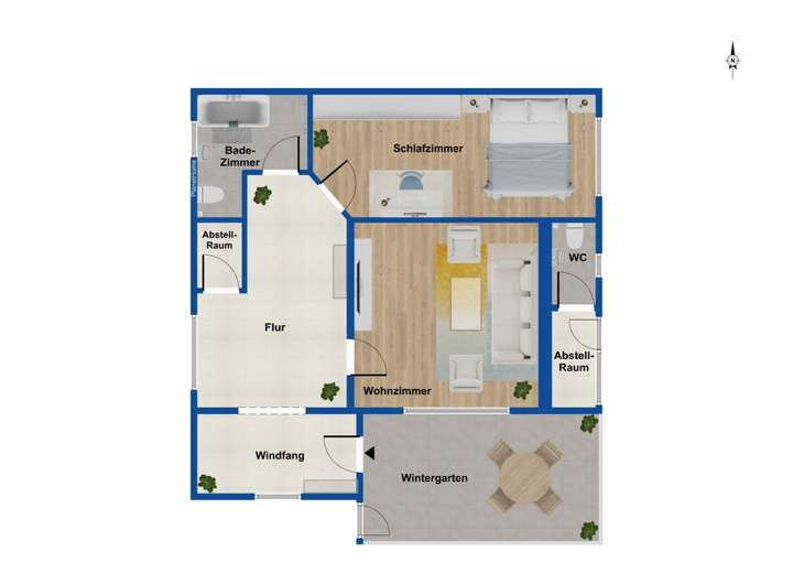 Ein besonderes Highlight ist der lichtdurchflutete Wintergarten, der den Wohnraum erweitert und ganzjährig einen wunderbaren Blick ins Grüne ermöglicht – ob bei Sonnenschein oder bei Regenwetter.