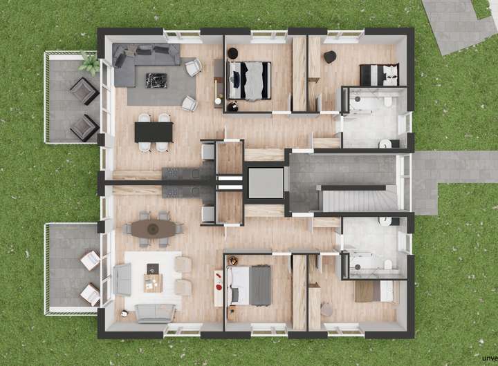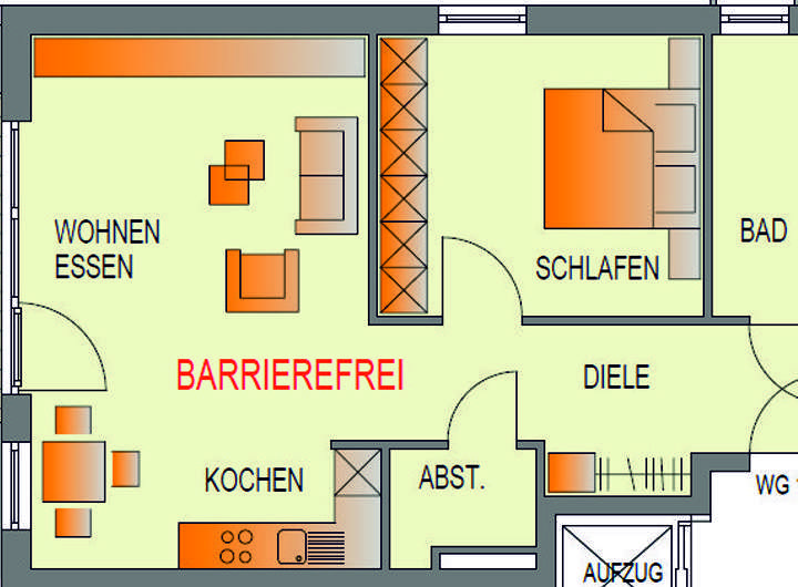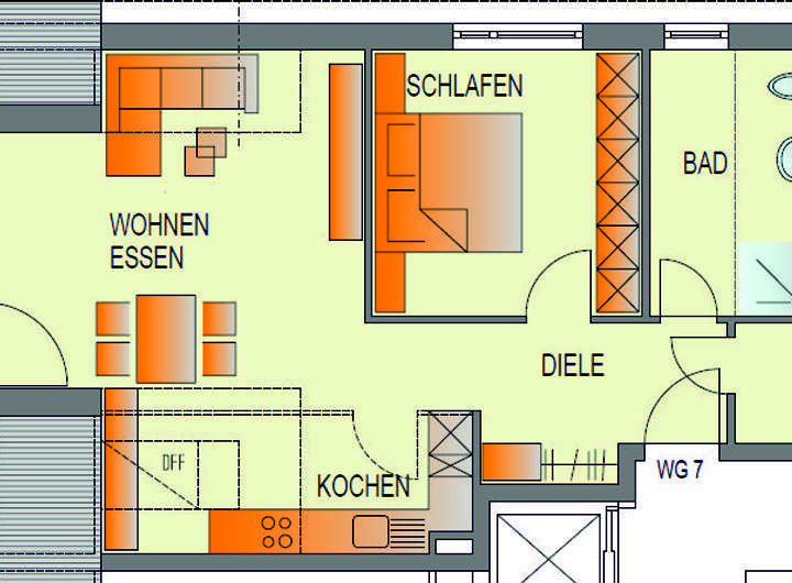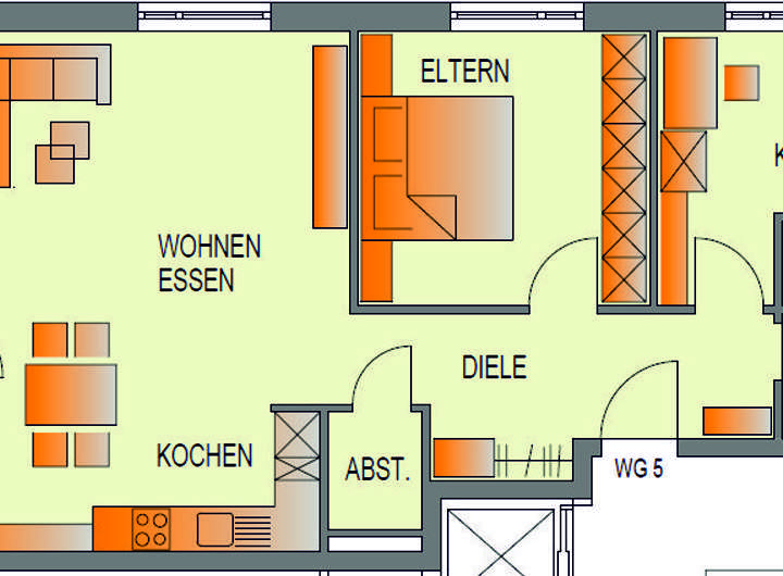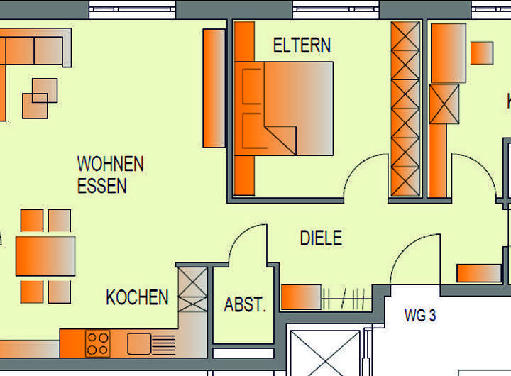 Die 2,5- bis 3,5-Zimmer-Wohnungen haben Wohnflächen zwischen 68 m² und 88 m² und verfügen über nach Süden ausgerichtete Terrassen mit Gartenanteil und Balkone.