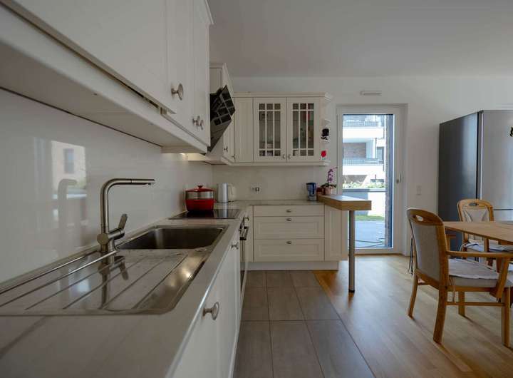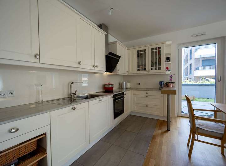 Die Einbauküche ist im Kaufpreis enthalten und bietet alles, was das Herz begehrt. Von hier aus haben Sie auch direkten Zugang zum Garten.