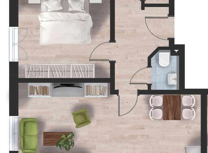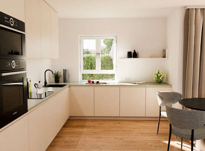 Der Grundriss mit bodentiefen Fenstern und charmanten Schnitten ist modern und lichtdurchflutet gestaltet.