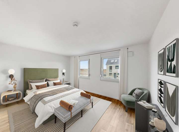 Flächenoptimierte Grundrisse und ein durchdachtes Raumnutzungskonzept machen die Reihenhäuser im Green Living zu einem perfekten Zuhause. Der offene Schnitt der Wohnbereiche, bodentiefe und teil-bodentiefe Fenster für lichtdurchflutete Räume, eine stilvolle Wand- und Bodengestaltung sowie das zeitlose Design der Bäder schaffen eine harmonische Verbindung von Funktionalität und Ästhetik. Hier finden Sie viel Raum für individuelle Gestaltung und ein Wohnambiente, das modernen Ansprüchen gerecht wird.