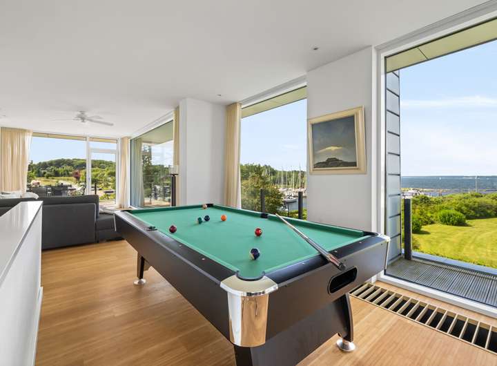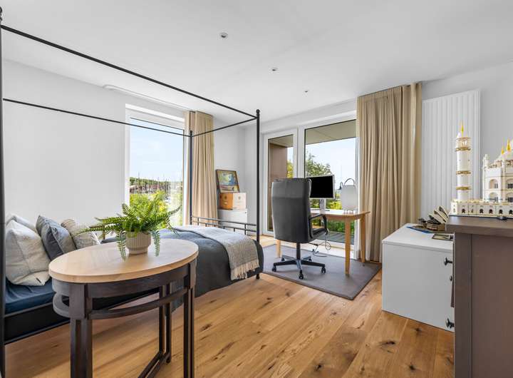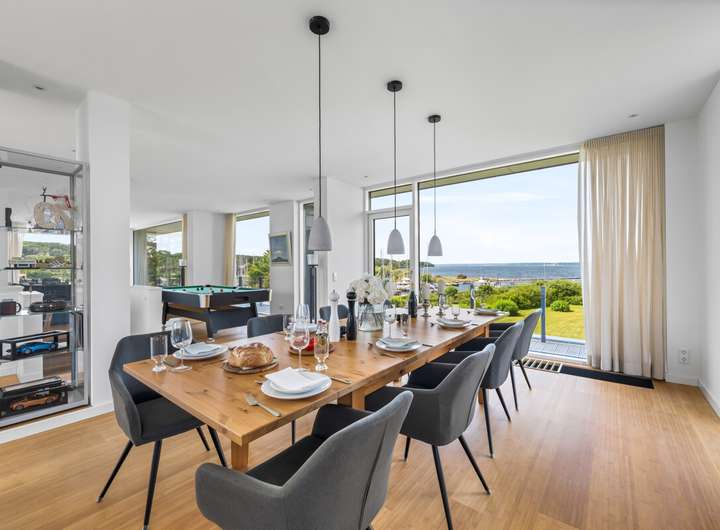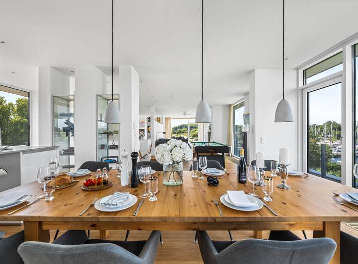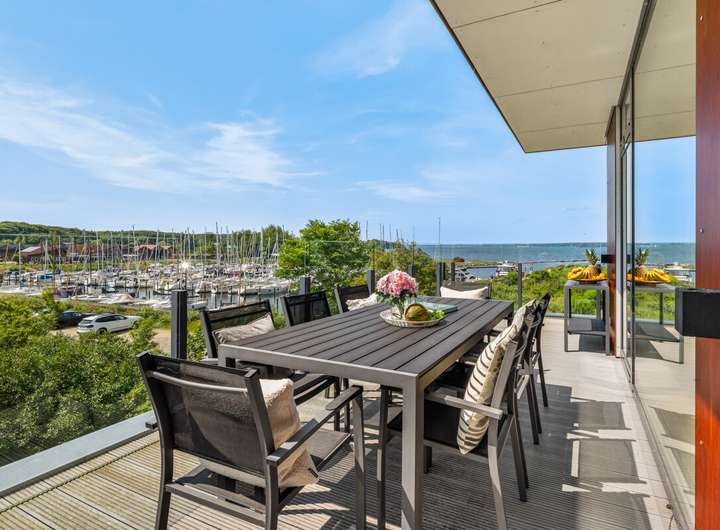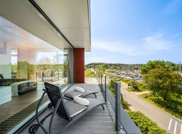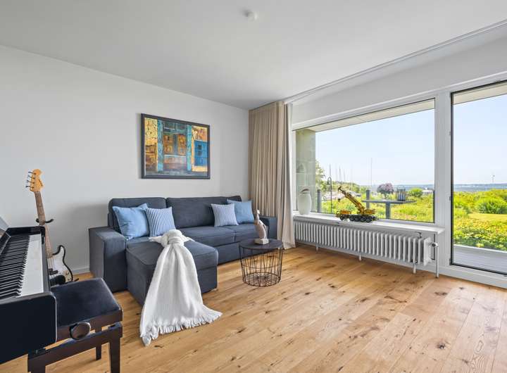 Die oberste Etage begeistert mit einem spektakulären Blick auf den Yachthafen und die Förde – ein echtes Highlight, das jeden Tag zum besonderen Erlebnis macht.