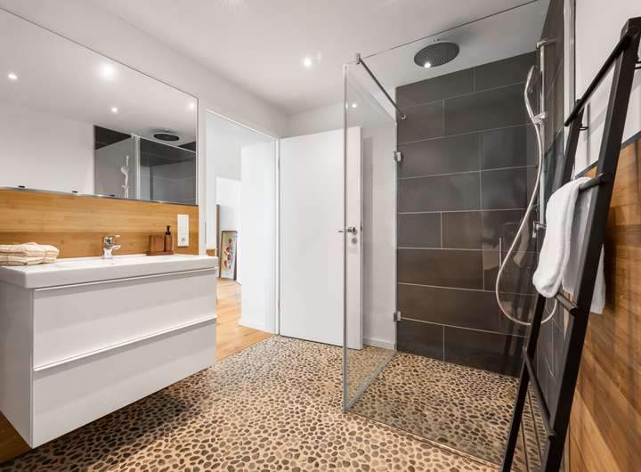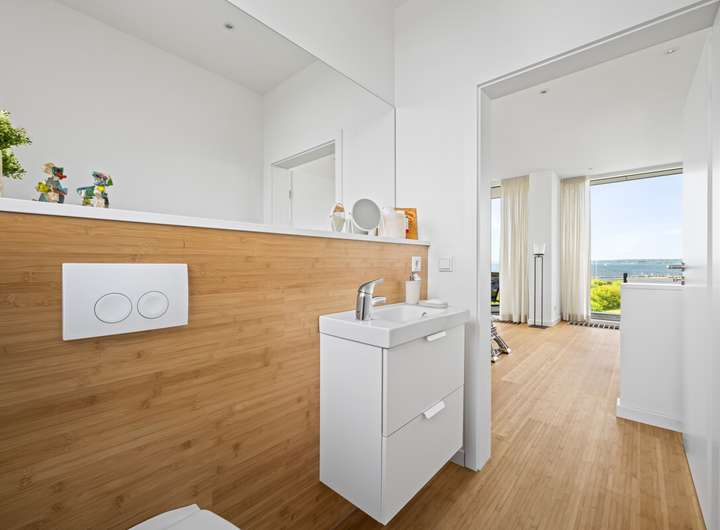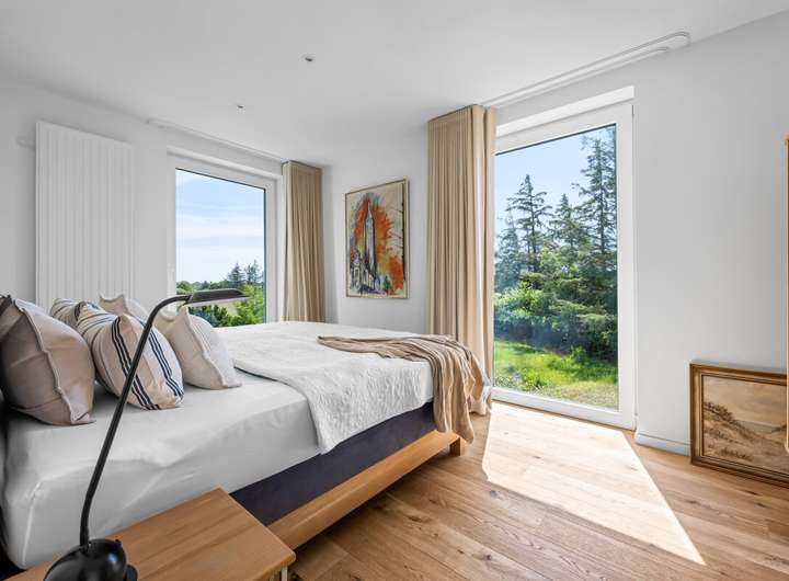 Der zentrale Wohnbereich besticht durch klare Linien, 5 gutgeschnittene Zimmer, ein stilvolles Bad sowie ein separates Gäste-WC. Große Fensterflächen sorgen auch hier für einen traumhaften Ausblick.