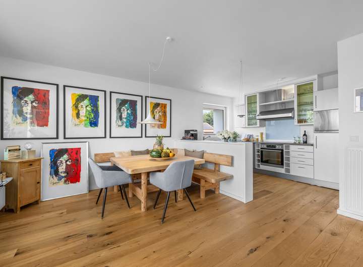 Das offene, großzügige Wohnkonzept mit moderner Küche schafft Raum für unvergessliche Begegnungen, lebendige Gespräche und genussvolle Stunden.