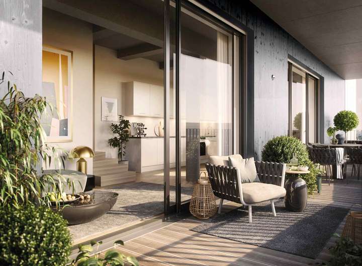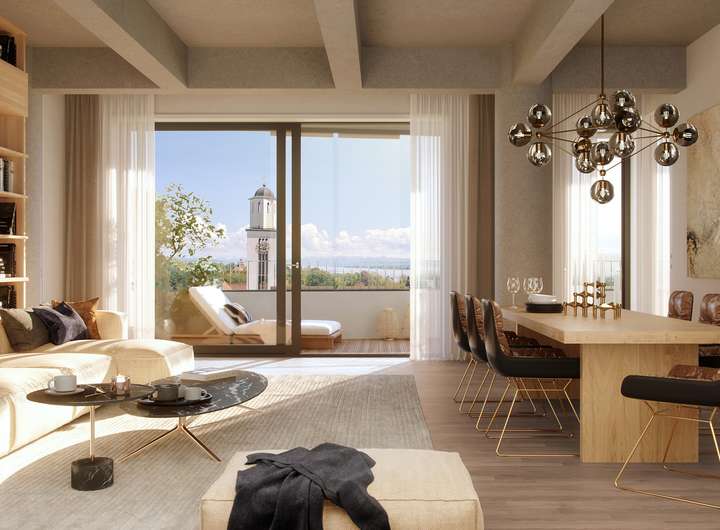 Die Innenräume der Wohnungen sind gleichermaßen weitläufig und komfortabel. Aufgrund der sorgfältig ausgewählten Materialien entsteht ein elegantes sowie modernes Lebensgefühl. Die großen Betonsäulen sowie die Träger geben Ihrem Wohnraum einen Rahmen im puristischen Stil. Zusammen mit Naturmaterialien wie Holzböden in hellen Farbtönen ergibt sich ein harmonisches Ambiente.