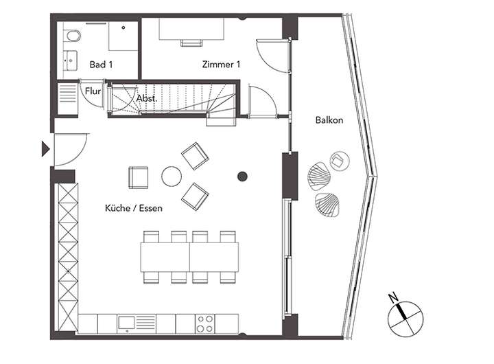Die hohen Innenräume werden zu modernen Lofts mit offenen Wohnbereichen ausgebaut. Somit bleibt die Grundstruktur des Gebäudes mit seinen runden Betonstützen und Decken mit offenen Unterzügen erhalten – dies gibt den Räumen durch ihre Weite eine besondere Wirkung. Großzügige Fensterfronten lassen das Tageslicht in die Räume strömen und schaffen ein Zuhause mit Offenheit, Helligkeit und einer wertigen Innenausstattung. Die geschwungenen Balkone erweitern den Wohnbereich nach außen und können größtenteils mit einer Schiebeverglasung zu ca. zwei Dritteln windgeschützt geschlossen werden.