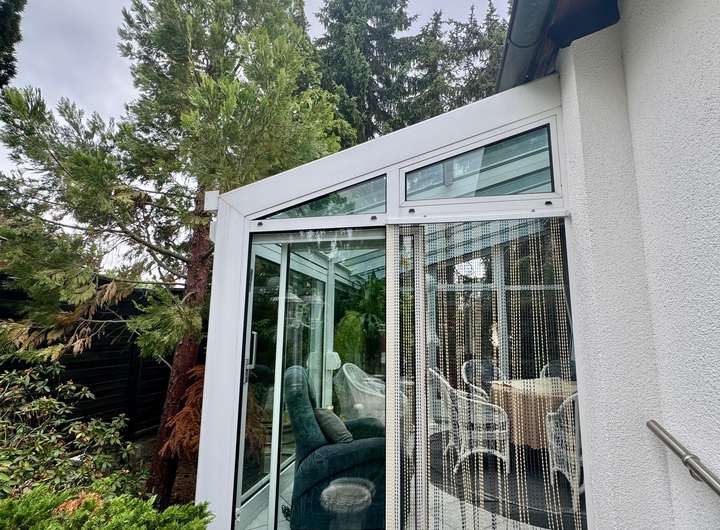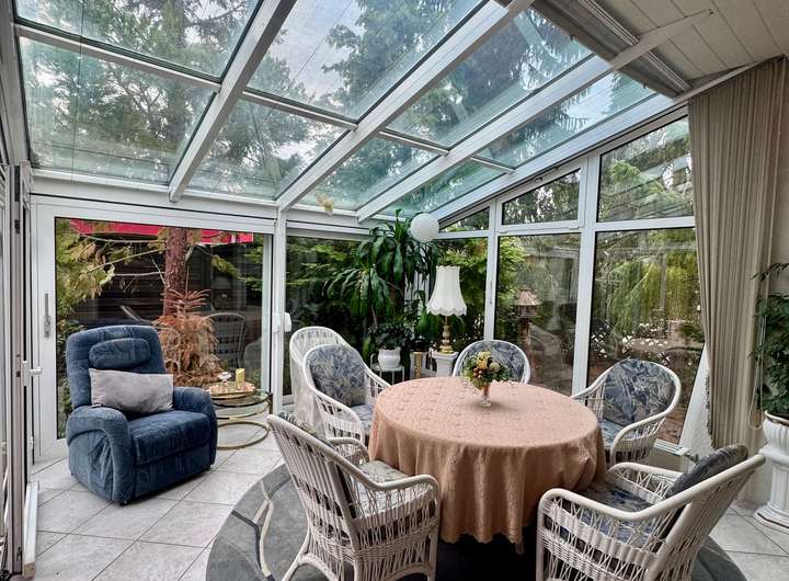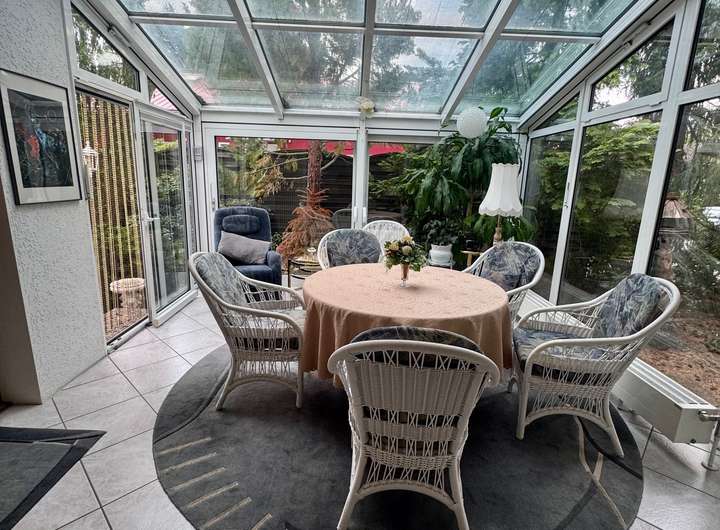 Der Wohnbereich wurde um einen großen, hellen Wintergartenanbau erweitert und hat zusätzlich eine Bar.