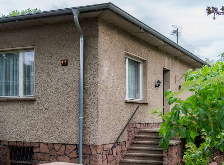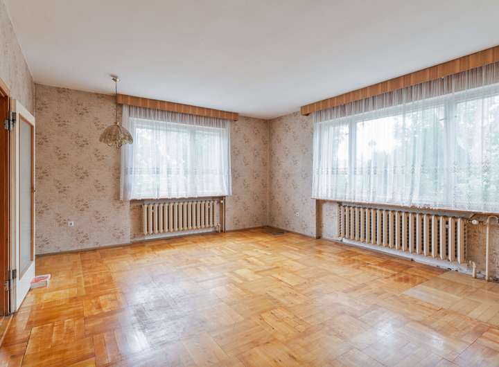 Das darauf befindliche freistehende Einfamilienhaus wurde in solider Stein-auf-Stein-Bauweise im Jahr 1971/72 errichtet und bietet ca. 120 m² Wohnfläche. Es ist voll unterkellert, inklusive einer integrierten Tiefgarage.
