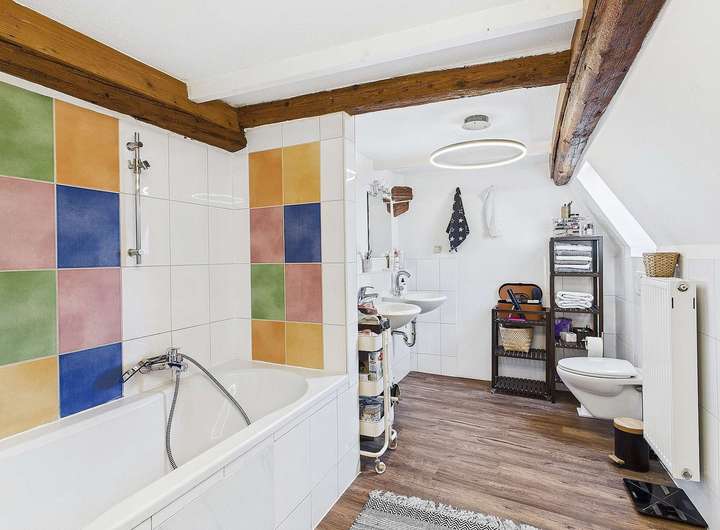 + Badezimmer: Badewanne, zwei Waschbecken, Toilette. (Baujahr Fenster 2021)