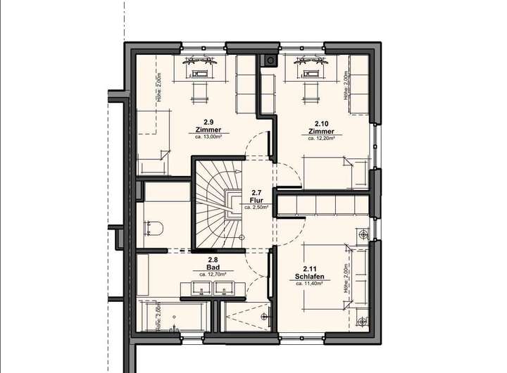 Im Obergeschoss befindet sich das Elternschlafzimmer und das helle Bad mit Doppelwaschtisch, Dusche und Badewanne. Die zwei Kinderzimmer mit je ca. 13 m² schaffen Platz für Ihre Familie. Im Spitzboden finden Sie zusätzlichen Raum für Hobbys oder ein Homeoffice.