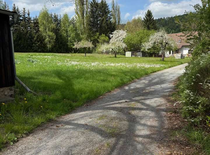 Blühende Obstbäume und der weite Blick ins Grüne schaffen eine besondere Atmosphäre, die Ruhe und Erholung verspricht. Eine gepflegte Zufahrt ist bereits vorhanden.