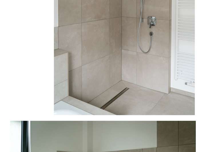 Das Wohnhaus verfügt über hochwertiges Eichenholzparkett, Fußbodenheizung, elektrische Rollläden, Tageslichtbäder und WC in Feinstein.