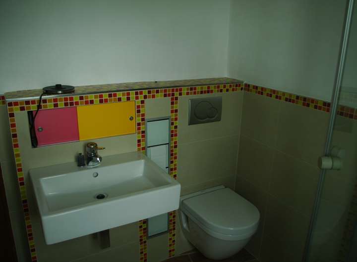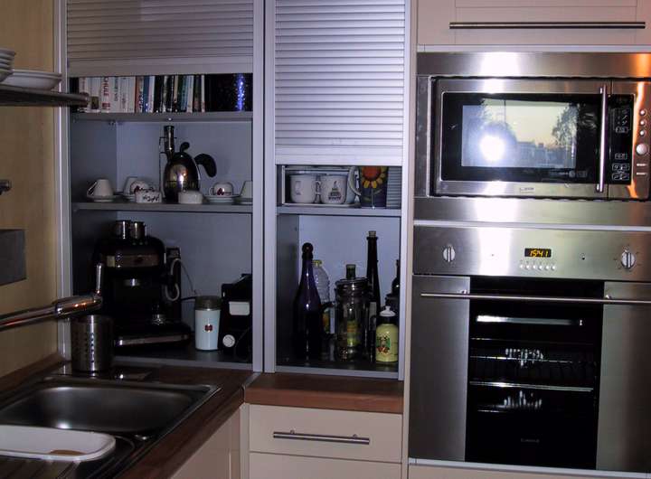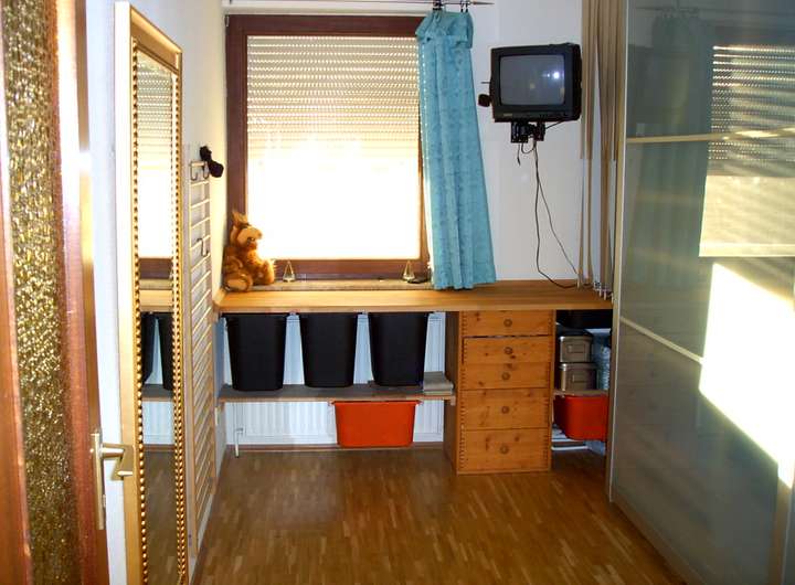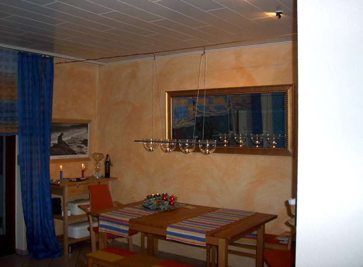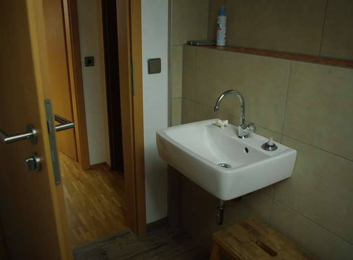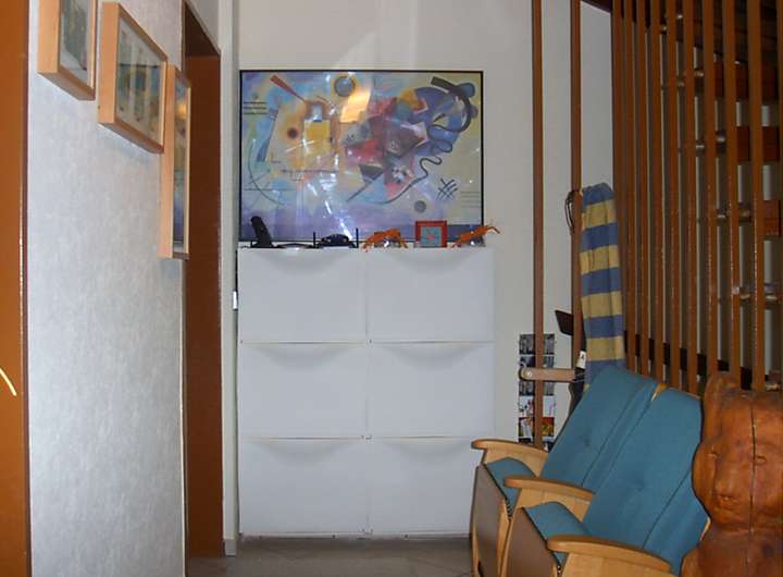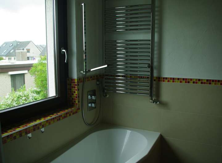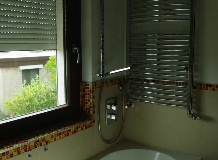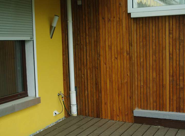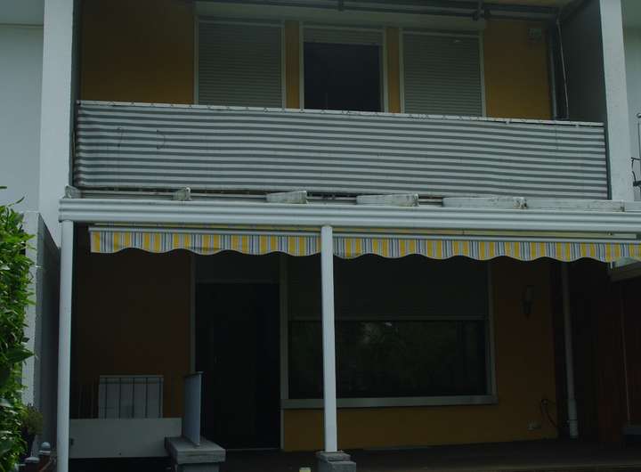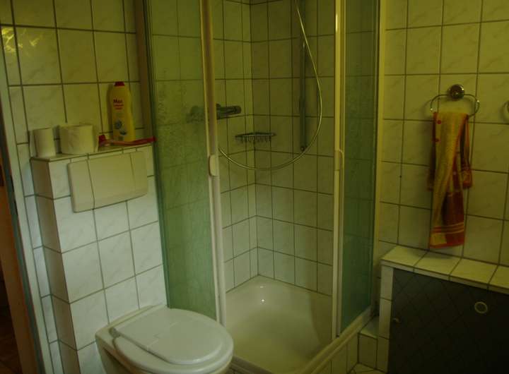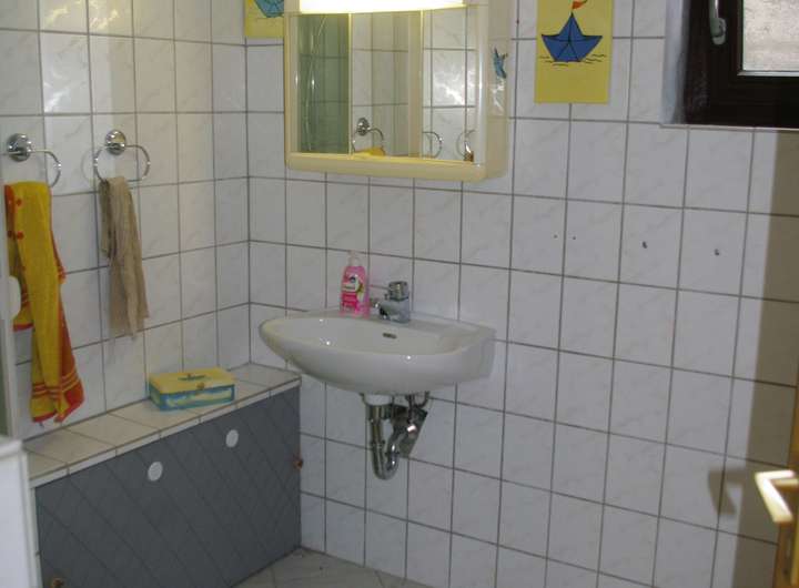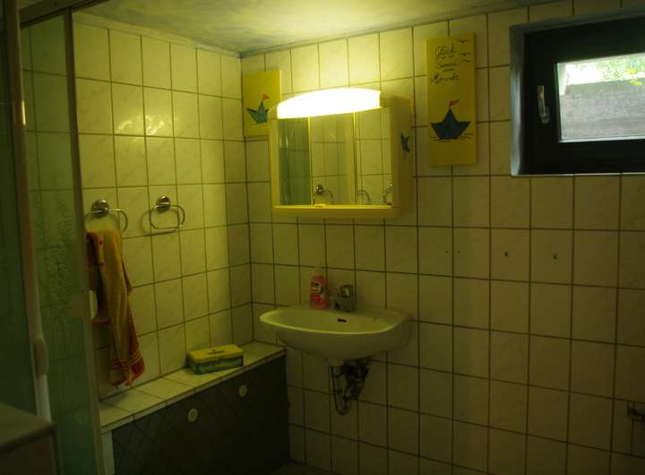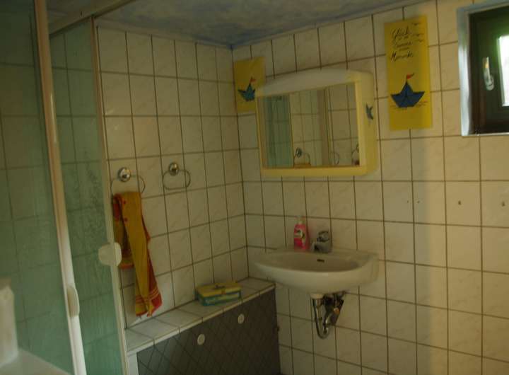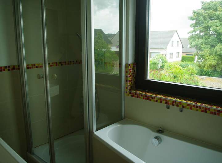 Ausstattung: Das EG ist mit Feinsteinzeug gefliest. Die Gartenterrasse ist mit Hartholz beplankt und hat eine Überdachung, die auch bei Regen zum Verweilen einlädt. Eine elektrische Markise ist vorhanden. Im Wohnzimmer ist ein Kaminofen, der in 2009 eingebaut wurde und eine behagliche Wärme liefert. Dieser Kamin erfüllt die aktuellen energetischen Bedingungen. Die Decke im Wohnzimmer ist mit weißen Parador Paneelen versehen. In den Decke sind Einbauleuchte eingebaut. Im Eingangsbereich befind.et sich ein Schuh- und Garderobenschrank. Im OG befinden sich drei Zimmer und ein Badezimmer mit Dusche und Wanne und eine Loggia. Das Badezimmer hat eine elektr. Fußbodenheizung und einen Badheizkörper. Die Zimmer und Flure im Ober- und Dachgeschoss sind mit Industrieparkett versehen. Die Rolläden zur Straßenseite sind elektrisch betrieben.