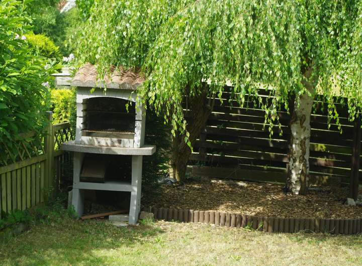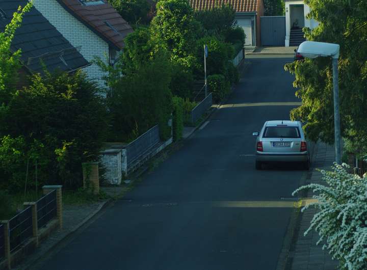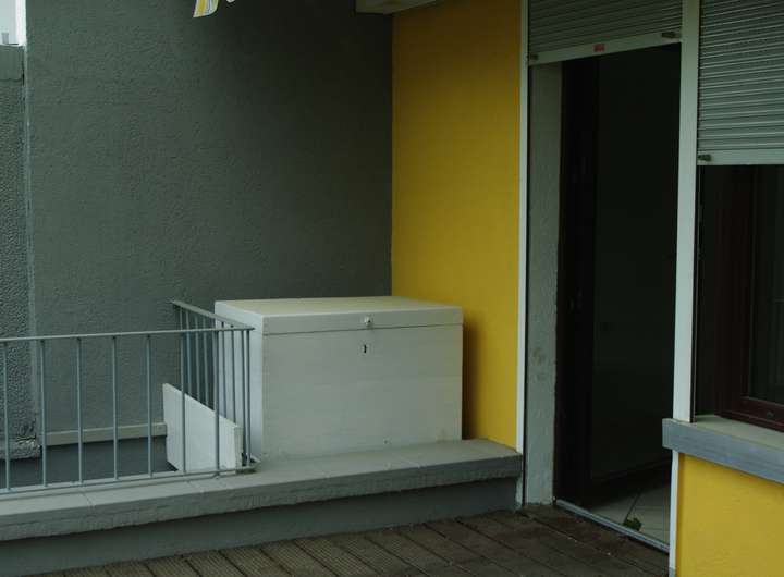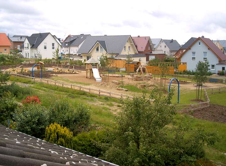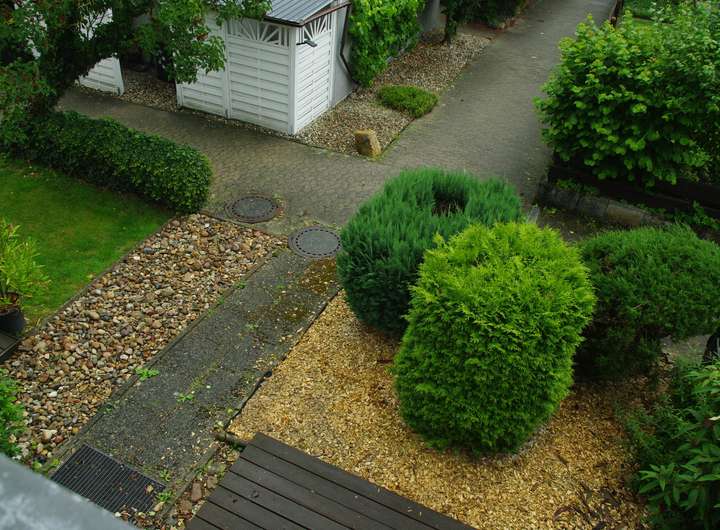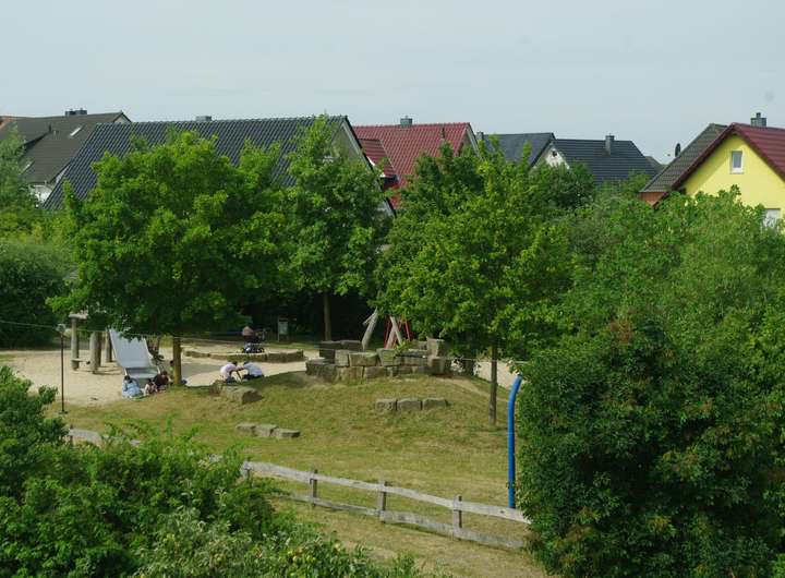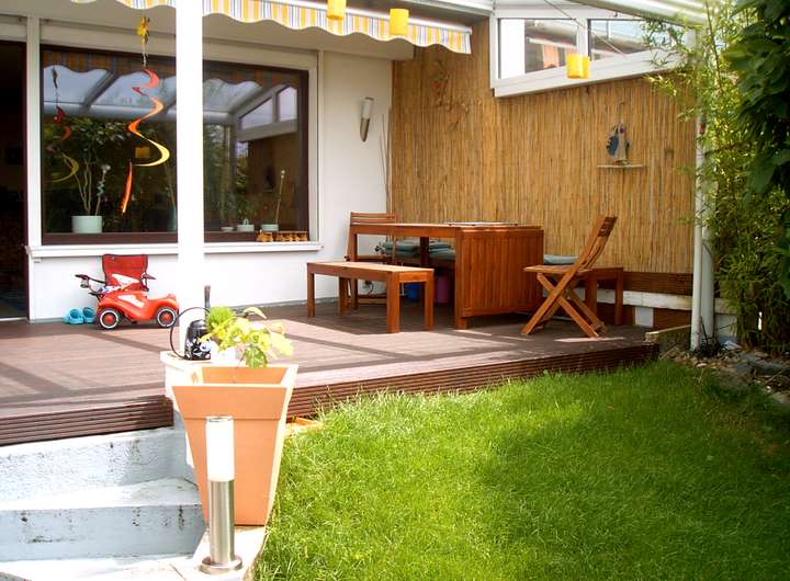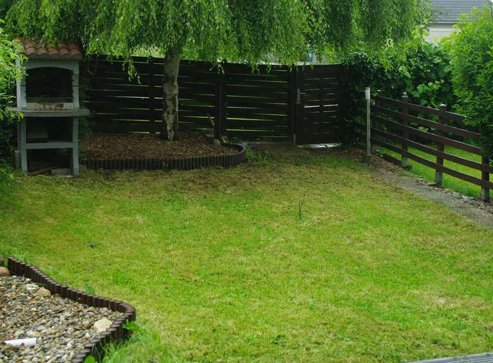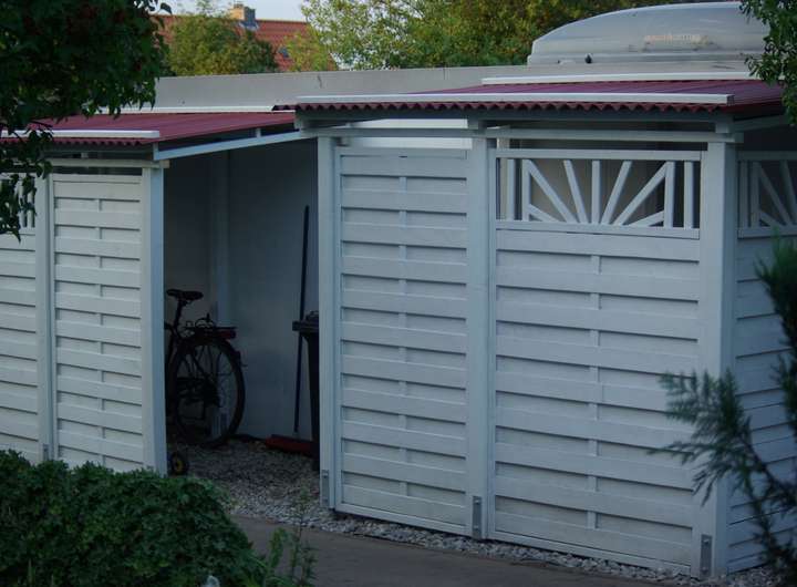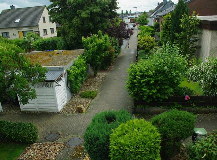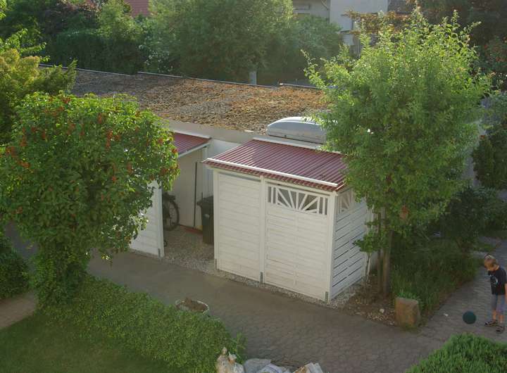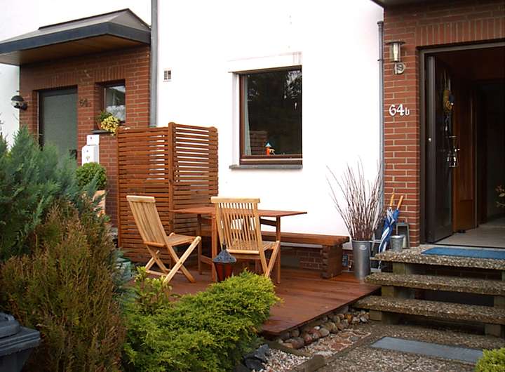 Die zum Mietobjekt gehörende Garage liegt auf einem angrenzenden Garagenhof. Da es die erste Garage dort ist, bietet sie einen Stellplatz vor der Garage. Die Garage ist mit einem Stromanschluss und mit einem neuen Sektionaltor versehen. Zur Nutzung gehört darüber hinaus ein an die Garage angebautes Bikeboard. Dieses bietet für bis zu vier Fahrrädern eine trockene Stellfläche. Das Haus hat eine Frühstücksterrasse, die an den Eingangsbereich grenzt und eine mit einem Terrassendach überdachte Terrasse im Garten. Angrenzend an den pflegeleichten Garten befindet sich eine öffentliche große Freifläche mit angrenzendem Spielplatz. Dadurch gibt es keinen direkten Pkw-Verkehr am Haus.