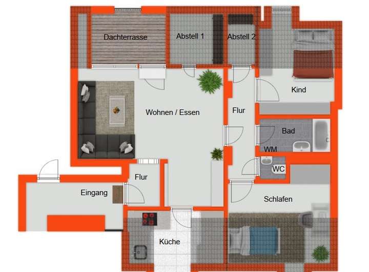 Die in den Grundrissen dargestellten Möbel und Kücheneinbauten können beispielhaft sein. Die Grundrisse können nicht maßstabsgetreu sein. Sie sind nicht zu Maßabnahme für die Möblierung geeignet. Visualisierungen aus Sicht des Illustrators.