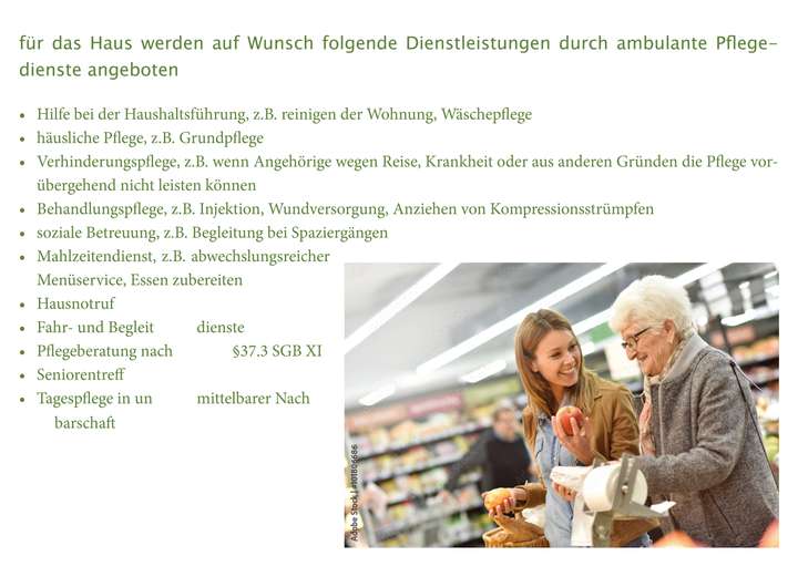 50 seniorenfreundliche Wohnungen werden so mit Servicedienstleistungen und Menü-Bringdienst, Einkaufsdienst, Hauswirtschaftliche Hilfen, Wäscheservice, Fahr- und Begleitdienst, Ambulante Pflege (Grundpflege), Freizeitgestaltungen, Beratung und Information sowie Verhinderungspflege, erbracht seitens des auf dem Areal ansässigen DRK, abgerundet. In jeder Wohnung steht ein 24/7-Notrufsystem zur Verfügung.