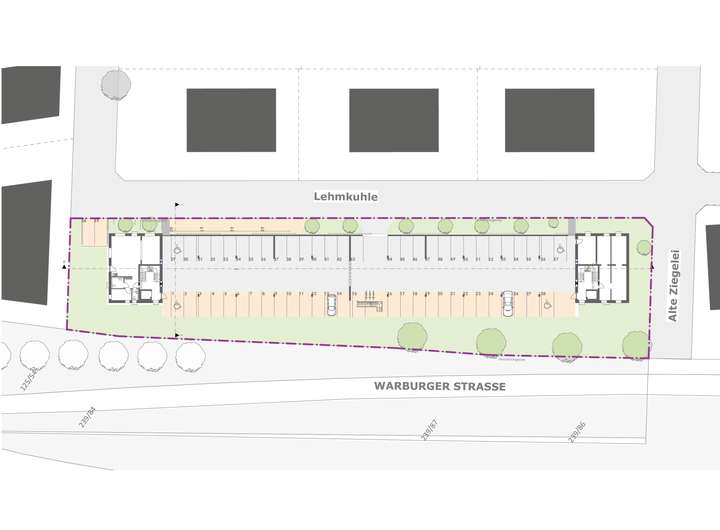 Eine große überdachte Parkfläche für 56 PKW befindet sich ebenfalls im Erdgeschoss. Weitere 7 Stellplätze sind auf den Außenflächen vorhanden.