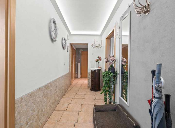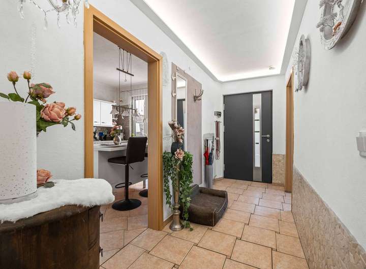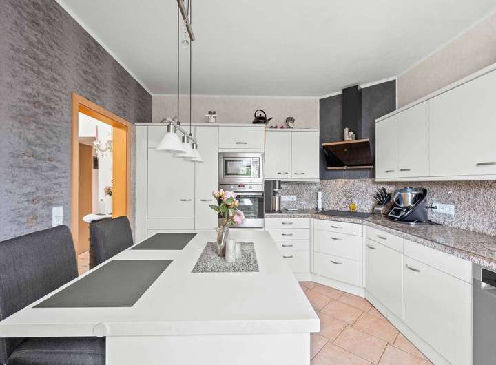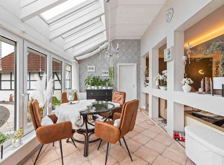 Das Haus verfügt über fünf Zimmer, darunter ein weitläufiges Wohnzimmer mit direktem Zugang zum Wintergarten. Ein freigelegtes Fachwerk-Holzelement im Wohnbereich unterstreicht den historischen Charakter und verleiht dem Raum eine besondere Atmosphäre. Die moderne Einbauküche ergänzt den Alltag funktional und zeitgemäß.