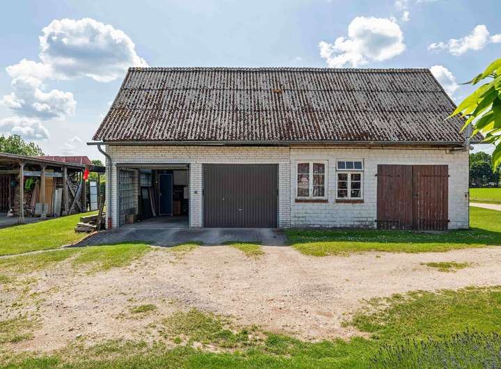 Im hinteren Bereich des Grundstücks befinden sich zwei große Carports , ideal für Wohnmobile oder Camper und eine großzügige Scheune mit drei integrierten Garagen – ideal für Pkw, Anhänger oder auch größere Fahrzeuge. Für handwerklich Interessierte bietet eine kleine Werkbank zusätzlichen Raum für Hobby oder Reparaturarbeiten.