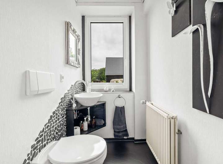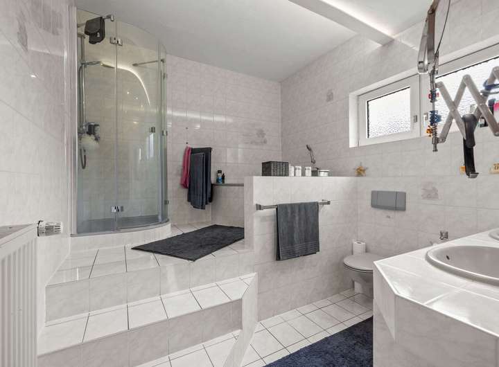 Ein Badezimmer mit Dusche und Badewanne sowie ein separates Gäste-WC schaffen praktische Voraussetzungen für das Familienleben oder eine Mehrgenerationennutzung. Im Obergeschoss befindet sich eine helle, offene Einliegerwohnung mit eigener Küche und Bad – flexibel nutzbar für Gäste, heranwachsende Kinder oder zur Vermietung.
