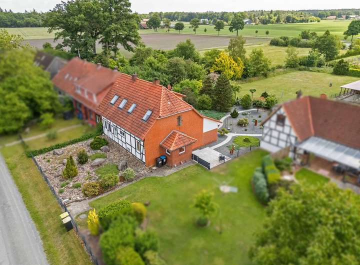 Dieses besondere Reihenendhaus blickt auf eine eindrucksvolle Vergangenheit zurück: Ursprünglich als Arbeiterwohnungen für Gut Sunder, wurde das Gebäude um 1900 an seinem heutigen Standort in traditioneller Fachwerkbauweise wiederaufgebaut – diesmal als Wohnhaus für die Mitarbeiter eines Hofes. Heute steht es auf einem großzügigen Grundstück von ca. 3.043 m² und bietet ca. 176 m² Wohnfläche – ideal für Menschen, die das Authentische suchen und viel Raum für eigene Verwirklichung und Ideen schätzen.