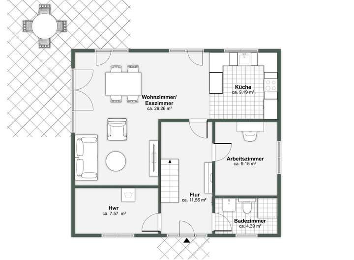 Das Erdgeschoss überzeugt durch seinen offen gestalteten Wohn-, Ess- und Küchenbereich, der viel Platz für individuelle Einrichtungsideen lässt und ein luftiges Raumgefühl vermittelt. Bodentiefe Kunststofffenster sorgen für optimale Lichtverhältnisse und ermöglichen den direkten Zugang zur Terrasse – ideal für entspannte Stunden im Freien. Ergänzt wird das Erdgeschoss durch ein weiteres individuell nutzbares Zimmer, ein tageslichthelles Gäste-WC sowie einen praktischen Hauswirtschaftsraum, komfortabel über die zentrale Diele erreichbar.