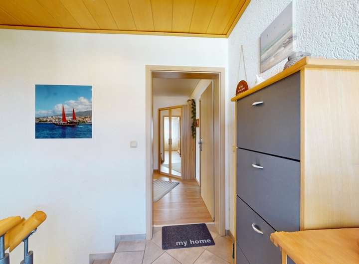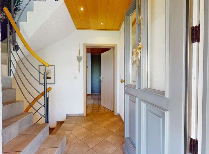 Empfangen werden Sie in dem Haus von der Eingangstüre mit anliegendem Treppenhaus, durch das Sie sowohl die Räume im Keller als auch die beiden Wohnungen im Er- und Obergeschoss erreichen können.