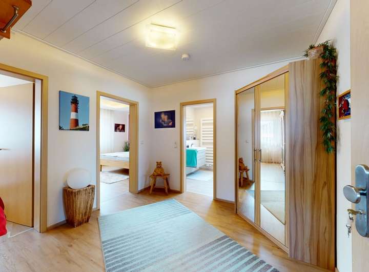 Durch den großzügigen Eingangsbereich sind die beiden Schlafzimmer, das sanierte Bad mit bodengleicher Dusche, WC und Waschbecken und auch der Essbereich direkt zu erreichen.