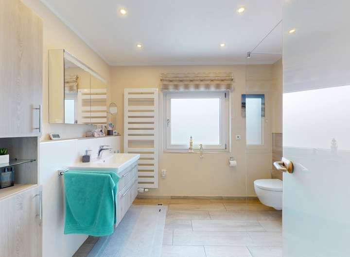 - Bad OG mit bodengleicher Dusche, WC und Waschbecken (2018 saniert)