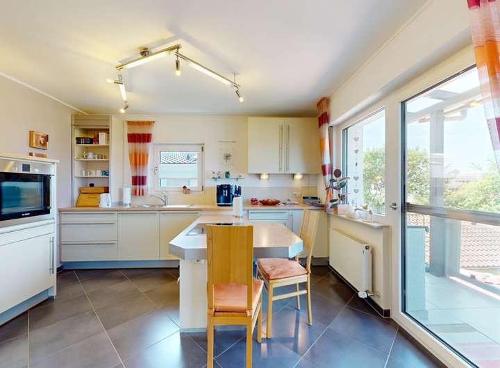 Die Küche (Einbauküche inklusive) mit direktem Balkonzugang schließt sich an das Esszimmer an.