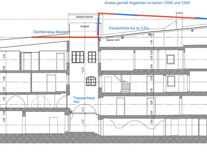 Im Dachgeschoss könnte eine sehr großzügige Penthouse-Wohnung entstehen. Kostenvoranschläge für die notwendige Dachanhebung liegen bereits vor. Eine großzügige Dachterrasse mit fantastischem Ausblick ist jetzt schon vorhanden.