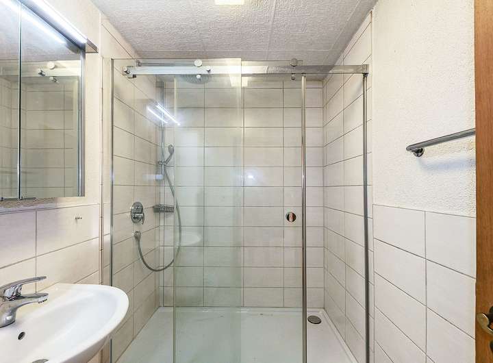 EG: Badezimmer ohne Fenster mit Dusche und Einzelwaschbecken
