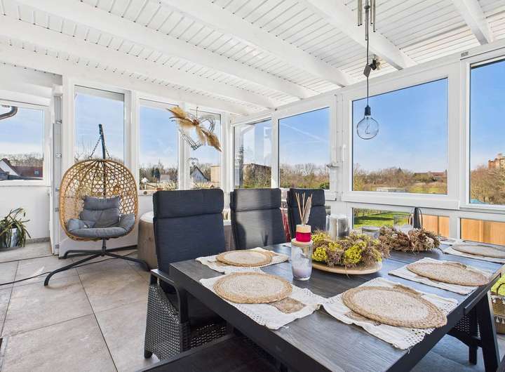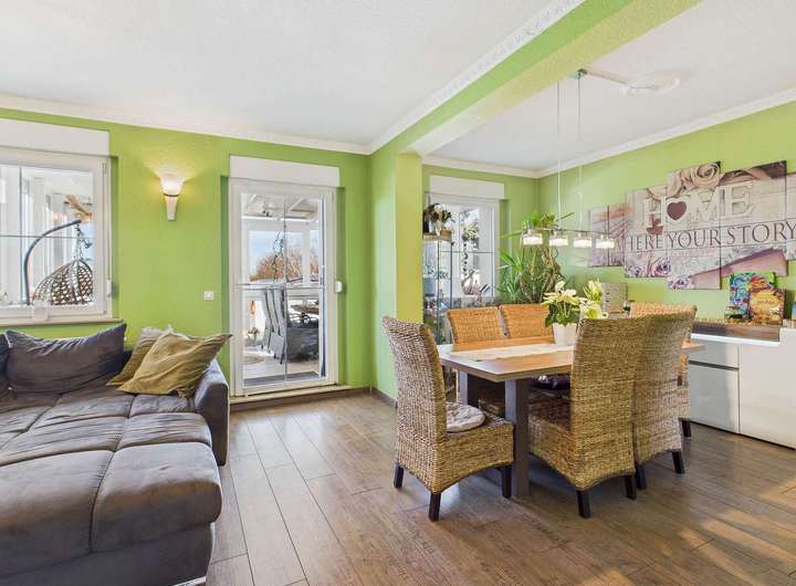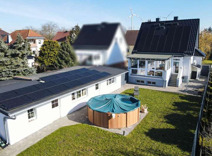 Das Haus verfügt über drei separate Hauseingänge, die perfekt für Mehrgenerationenwohnen oder eine Symbiose aus Arbeiten und Wohnen geeignet sind. Diese Eingänge ermöglichen einen praktischen Zugang zum Keller, Haupteingang und einem großzügigen Wintergarten. Der Wintergarten bietet einen atemberaubenden Blick auf das begrünte Grundstück von ca. 1.037,00 m², das mit einem Pool ausgestattet ist, der über eine eigene Wärmepumpe verfügt, sowie einem Gerätehaus und einer Werkstatt. Ein Kamin im Wohnzimmer (2018) sorgt für eine gemütliche Atmosphäre, während die moderne Einbauküche (2022) zum Kochen einlädt.