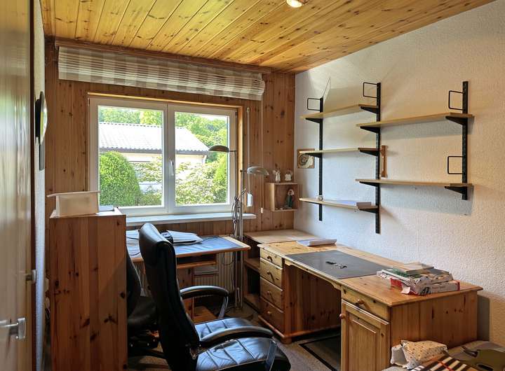 Er wurde im amerikanischen Stil gebaut und verfügt in fast allen Räumen über praktische Einbauschränke. Große Glasfronten spenden viel Licht und bieten einen freien Blick in den gepflegten Garten. Die Räume sind alle quadratisch geschnitten und somit haben Sie viel Stellmöglichkeiten für Ihr Mobiliar. Bis auf ein Blumenfenster wurden alle Fenster 2013 gegen isolierverglaste Holzfenster der Firma Lantz ausgetauscht und teilweise mit elektrisch sowie mechanisch betriebenen Rollläden ausgestattet. Vor einigen Jahren wurde das Dach mit Metallpfannen neu gedeckt und 2008 wurde die Heizung erneuert. Die Terrasse ist teilüberdacht und lädt somit bei jedem Wetter zum Verweilen ein.
