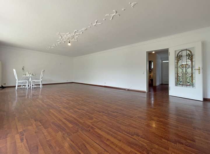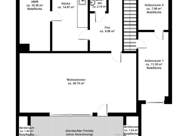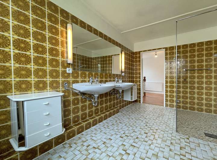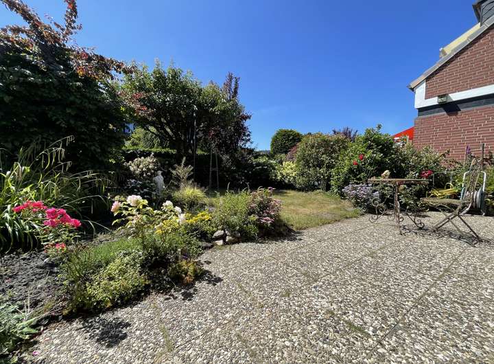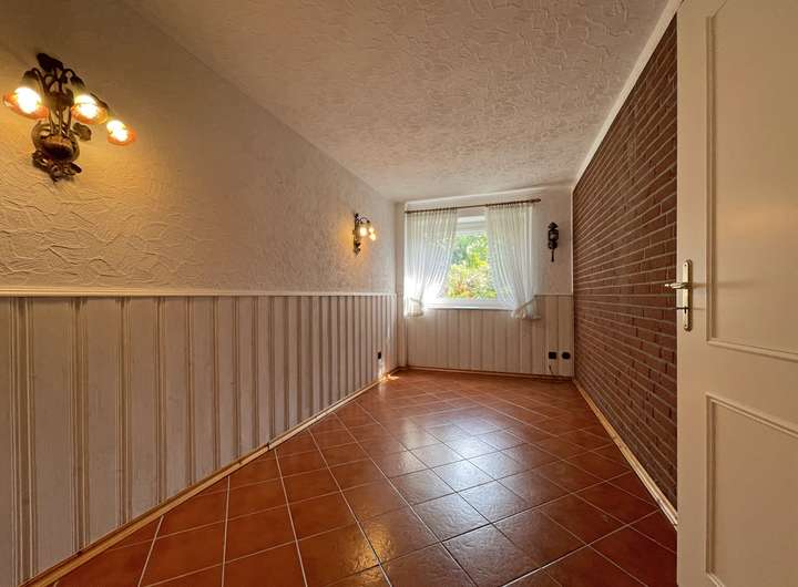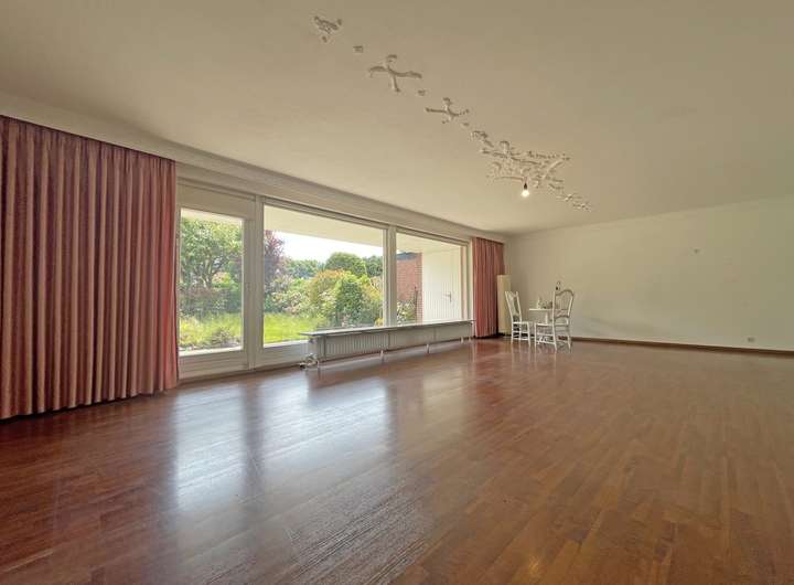 Die ca. 138 m² Wohnfläche verteilen sich im Erdgeschoss auf einen Flur, ein Gäste-WC mit Fenster, ein großzügiges Wohnzimmer, eine Küche mit einem anschließenden Hauswirtschaftsraum und einen im Jahre 1979 errichteten Anbau. Diese Gebäudeerweiterung bietet ca. 18 m ² wohnlich gestaltete Nutzfläche. Durch einen zusätzlichen Außenzugang ergeben sich hier vielfältige Nutzungsmöglichkeiten. Auf dieser Etage lässt sich vom Wohnbereich aus über die geschützte Terrasse der südlich ausgerichtete Garten betreten.