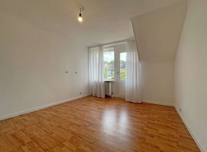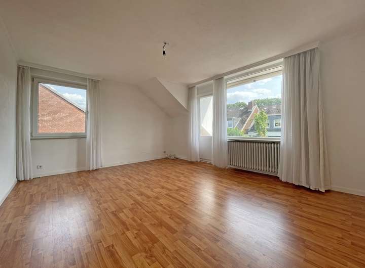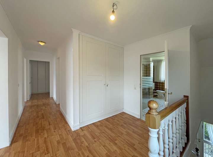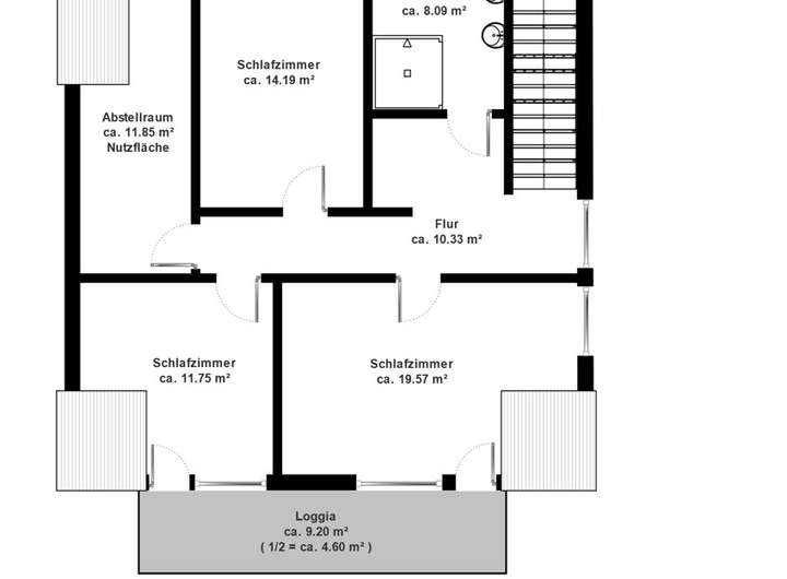 Über eine offene Holztreppe gelangen Sie in den Flur des Dachgeschosses. Hier stehen den Bewohnern drei Schlafzimmer zur Verfügung, wovon zwei den Zugang zu einer Loggia ermöglichen. Das Badezimmer verfügt über eine Dusche und zwei Waschbecken. Komplettiert wird das Raumangebot auf dieser Ebene von einem im Stil der restlichen Räume ausgebauten Abstellraum mit Fenster, der ca. 12 m² Nutzfläche bietet und sich aufgrund eines Einbauschranks ideal als Ankleidezimmer eignet. Der über eine Auszugstreppe vom Flur aus erreichbare ausgebaute Spitzboden stellt weitere Stellfläche zur Verfügung.