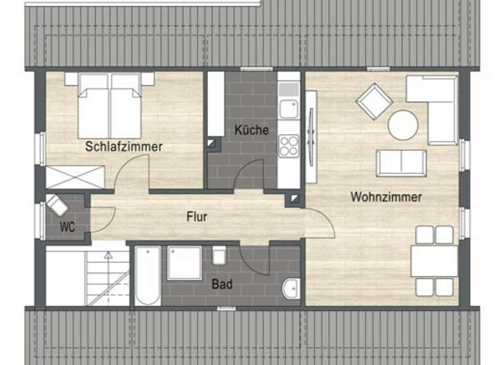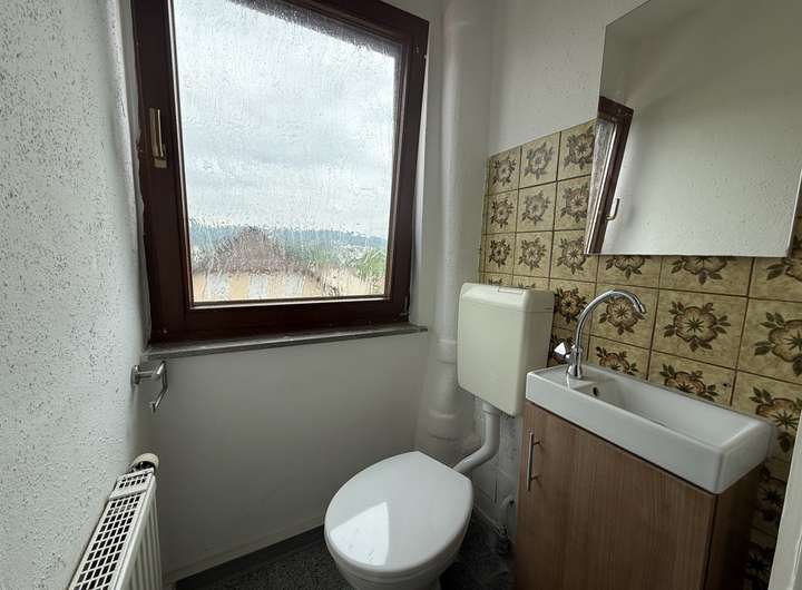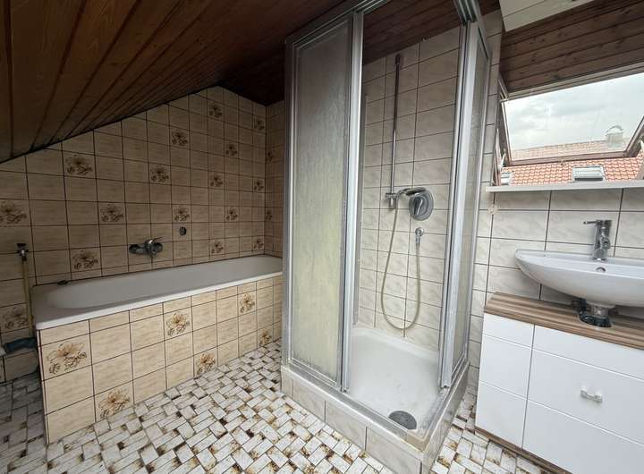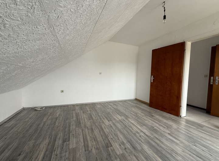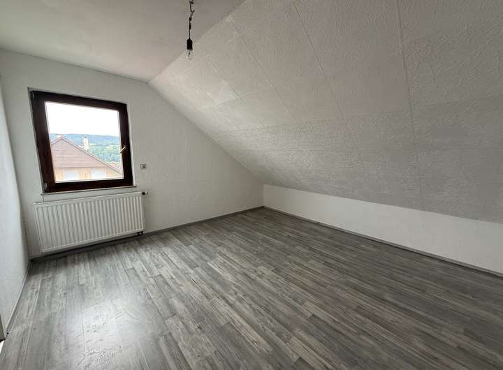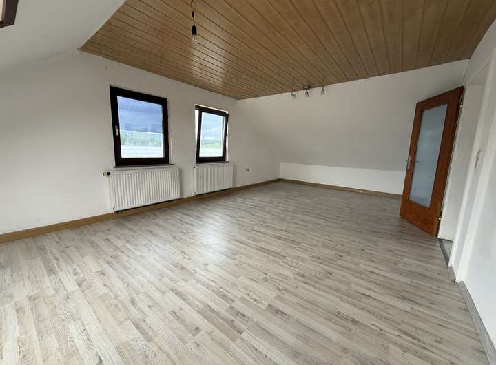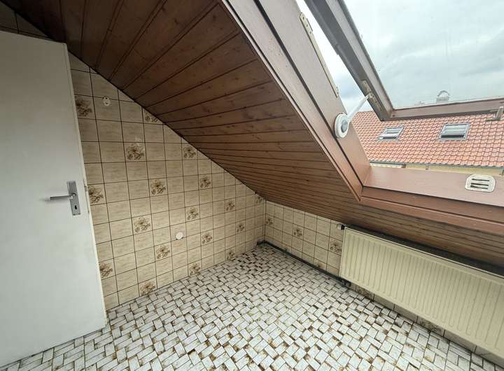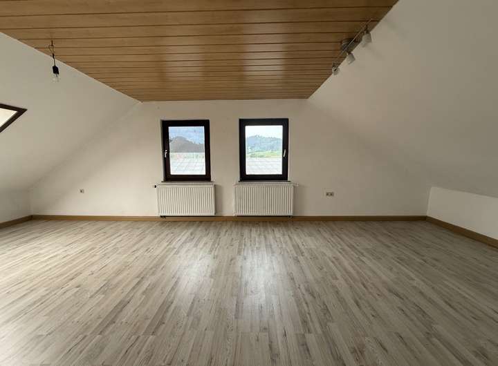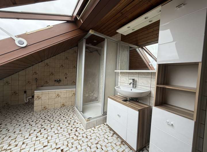 Diese helle 2-Zimmer Mietwohnung befindet sich im Dachgeschoss eines 3-Familienhauses. Die Mietwohnung verfügt über eine Wohnfläche von ca. 60 m², verteilt auf 2 Zimmer, darunter ein großes Wohn- und Esszimmer und ein gemütliches Schlafzimmer. Im Badezimmer befindet sich ein Fenster, eine Badewanne und Dusche sowie ein Waschbecken. Das WC ist separat.