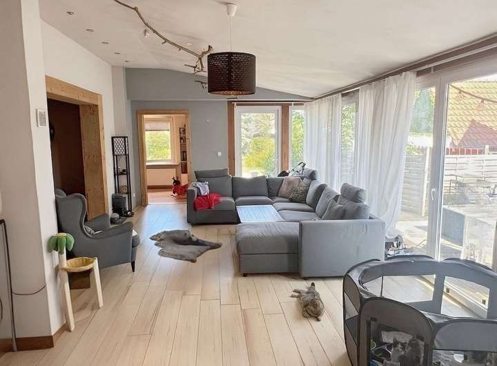 Die helle Einbauküche ist im Kaufpreis enthalten und in gutem Zustand. Das Wohnzimmer ist mit großen Fensterfronten zur Terrasse ausgestattet und schafft ein luftiges, offenes Wohngefühl. Das Bad im Obergeschoss ist renovierungsbedürftig, bietet aber viel Potenzial zur Modernisierung. Zusätzlich besteht die Möglichkeit, einen kleinen Raum im Eingangsbereich zu einem Gäste-WC umzubauen.