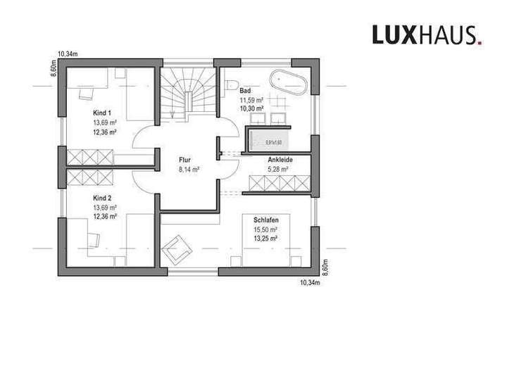 Im Obergeschoss befinden sich zwei identische (gespiegelte) Kinderzimmer und ein gemeinsames Badezimmer mit freistehender Badewanne. Das Schlafzimmer verfügt über eine Sitzecke mit Bücherregalen. Über eine Ankleide erreicht man über eine Schiebetür direkt das Bad.