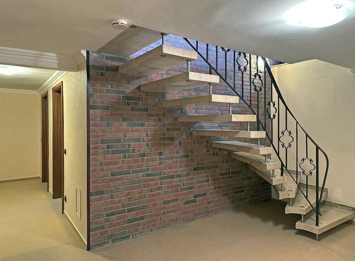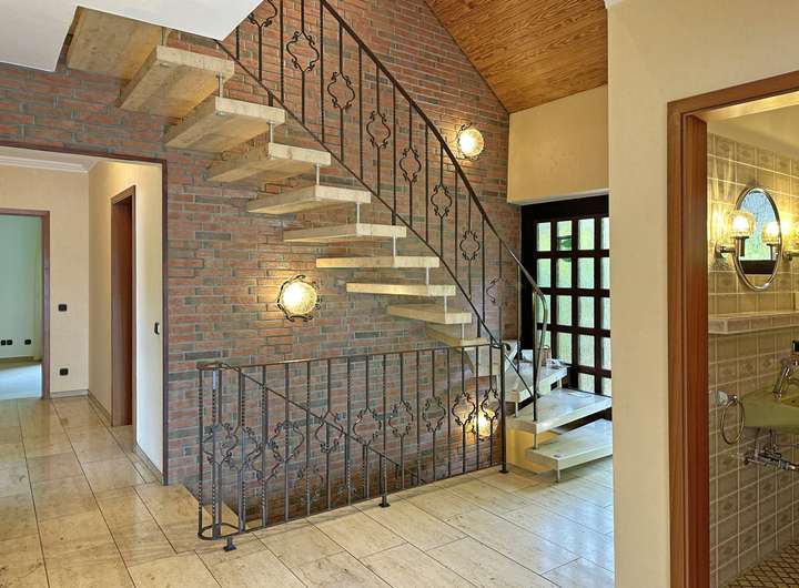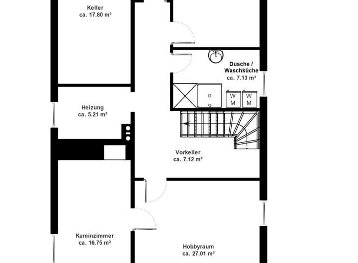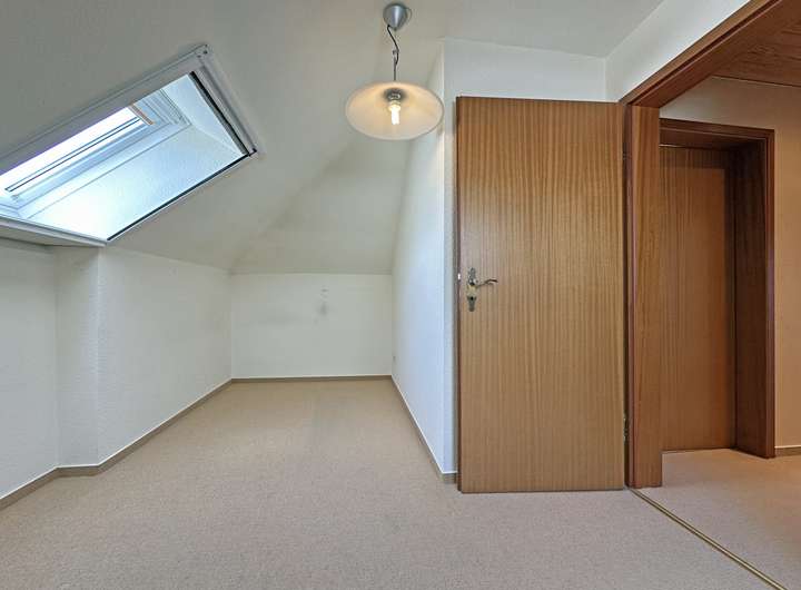 Der Eingangsbereich gewährleistet Zugang zu allen Ebenen. Im Erdgeschoss stehen ein großzügiger Wohn- und Essbereich mit Zugang zur Terrasse und zur separaten Küche zur Verfügung. Auf dieser Ebene befinden sich außerdem noch ein Arbeitszimmer, ein Schlafzimmer und ein Wannenbad, welches sowohl vom Schlafzimmer, als auch vom Flur aus begehbar ist. Darüber hinaus gibt es ein Gäste-WC. Im Dachgeschoss befinden sich zwei weitere Zimmer, eines davon mit Loggia. Zudem gibt es hier noch ein Duschbad und eine Abstellkammer. Der Keller ist teilweise wohnlich ausgebaut und verfügt neben einem Kaminzimmer, ein weiteres Duschbad, einem Hobby- und einem Mehrzweckraum, einen klassischen Keller- sowie einen Heizungsraum.