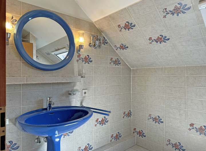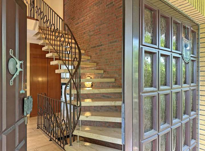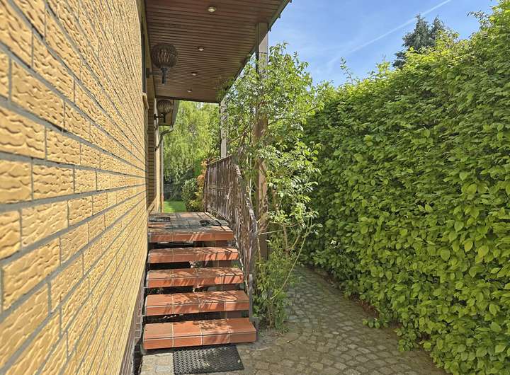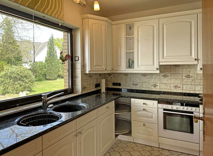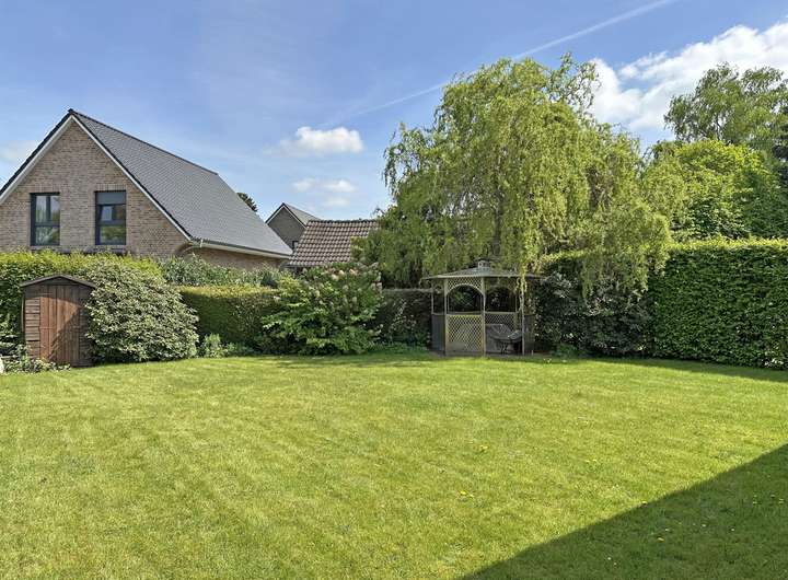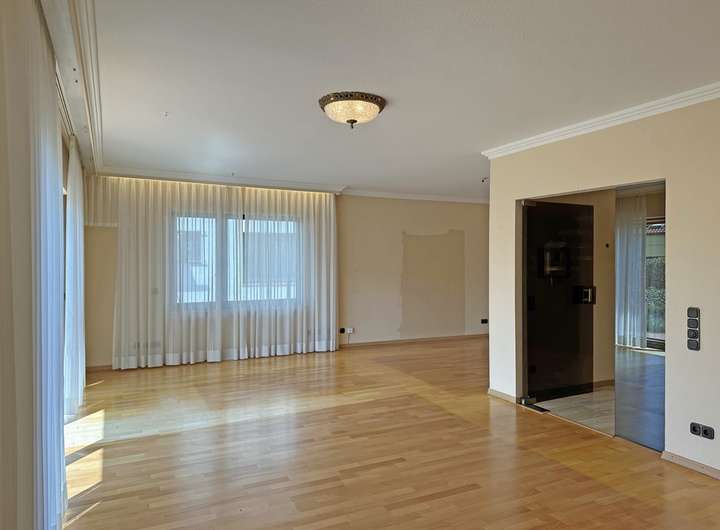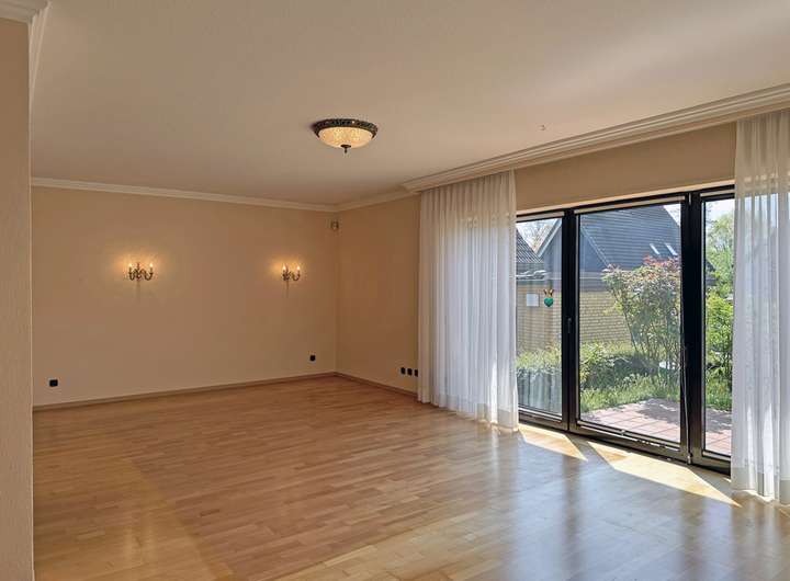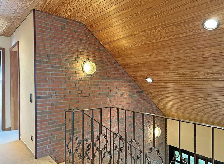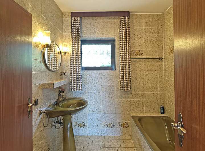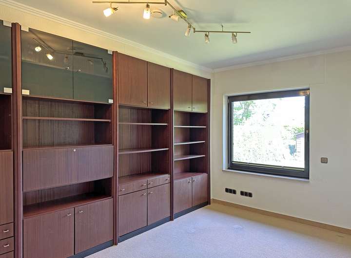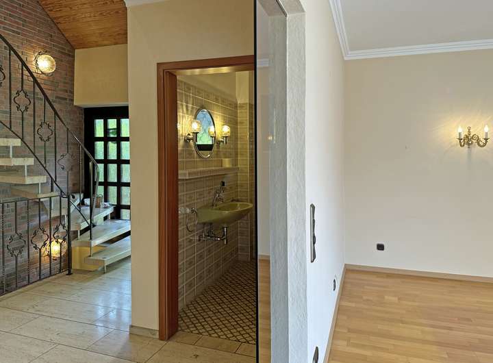 Ein vielseitiger Grundriss, ausreichend Platz, auch für eine größere Familie und das in familienfreundlicher und grüner Umgebung – das bietet Ihnen diese Immobilie. Die Ausstattung des Hauses wurde damals qualitativ hochwertig ausgewählt, entspricht jedoch in weiten Teilen nicht mehr dem heutigen Stand. Dem Baujahr entsprechend, präsentieren sich weite Teile der Technik. Dies gilt für das Dach sowie für die Fassade, Elektrik, Leitungen und für die doppelt verglasten Fenster. Alle Fenster im Erdgeschoss verfügen über Außenrollläden. Die Heizungsanlage (Brennwerttechnik) wurde hingegen 2005 erneuert und wird mit Gas befeuert. Die Warmwasserversorgung erfolgt elektrisch per Durchlauferhitzer. Alle Ebenen werden über eine Fußbodenheizung beheizt, auch der Keller. Im Mauerwerk des Kellerbereichs zeigt sich an einigen Stellen baujahrestypische Feuchtigkeit. Die Immobilie bietet insgesamt drei Bäder und ein Gäste-WC, jeweils baujahresentsprechend. Zur weiteren Ausstattung gehören eine Einbauküche, ein gemauerter Kamin im Keller und eine Alarmanlage. Im Außenbereich stehen zwei Gärten, eine Südwest-Terrasse, ein Brunnen sowie ein Pavillon und ein Schuppen bereit. Darüber hinaus gibt es eine Garage und Außenstellplätze.