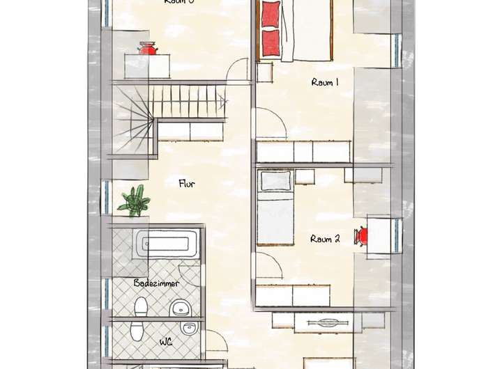 Die erste Wohneinheit verfügt im EG über einen Windfang, eine Diele, eine Wohnküche mit angeschlossenem Hauswirtschaftsraum sowie über ein Schlafzimmer und ein Duschbad. Im Obergeschoss stehen neben einem Flur weitere 3 Zimmer und ein Vollbad zur Verfügung.