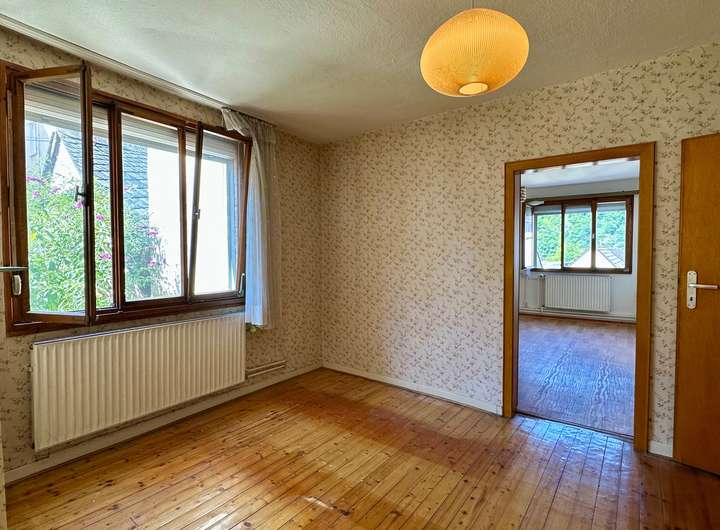 Im EG befindet sich moselseitig das Wohnzimmer gelegen und steht über den Flur in Verbindung zur Wohnküche. Von hier aus ist das Badezimmer zu betreten.