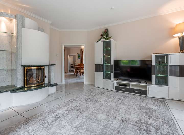 Schon beim Betreten des Hauses spüren Sie die Offenheit und Großzügigkeit: breite, rollstuhlgerechte Türdurchgänge sowie eine überdurchschnittliche Deckenhöhe im Erdgeschoss von 2,80 m verleihen den Räumen ein luftiges, modernes Wohngefühl. Herzstück des Hauses ist das helle Wohnzimmer mit einem stilvollen Kamin mit Außenluftanschluss, der an kühlen Tagen für behagliche Wärme sorgt.