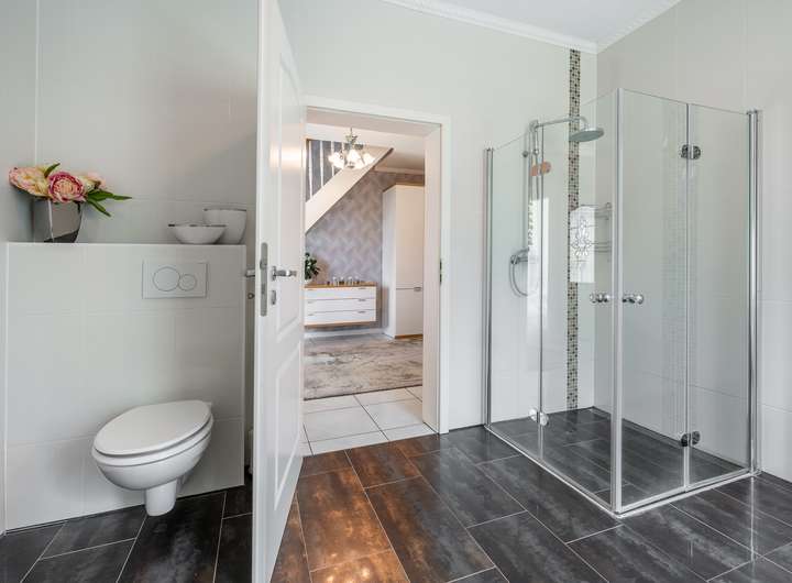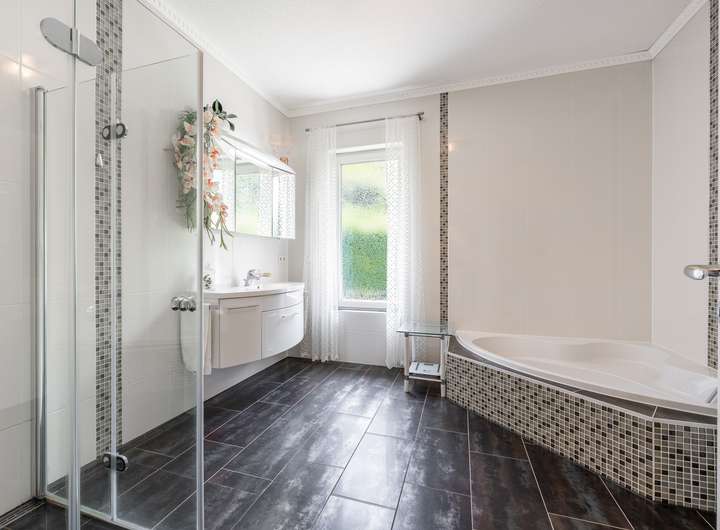 Das luxuriöse Badezimmer punktet mit einer eingelassenen, komfortablen Eckbadewanne, die ein entspanntes Ein- und Aussteigen ermöglicht, sowie einer barrierefreien Eckdusche – ein echtes Highlight für alle Altersgruppen.