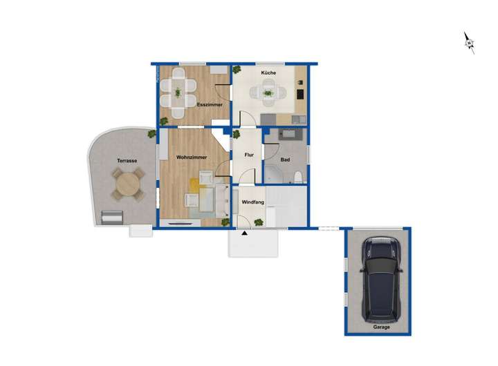 Eine Garage gehört ebenfalls zum Haus und ergänzt die fünf vorhandenen Stellplätze – somit ist reichlich Platz für Fahrzeuge, Fahrräder oder Gartengeräte vorhanden.