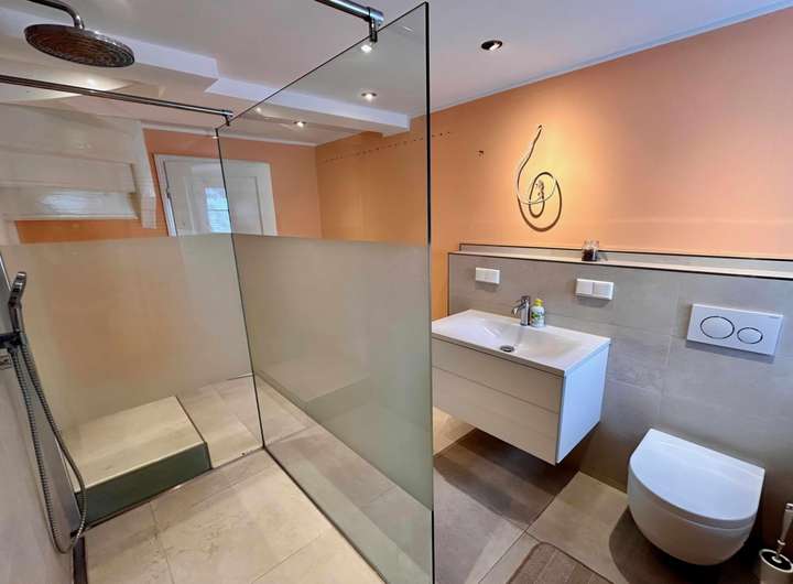 Das moderne Bad ist mit einer begehbaren Dusche, viel Helligkeit und genügend Platz für Waschmaschine und Trockner, als auch Schränken ausgestattet. Bad und Flur wurden komplett neu in Sandtönen gefliest und gedämmt, als auch mit modernen Anschlüssen ausgestattet. Das Bad ist ebenerdig und barrierefrei ausgestattet.