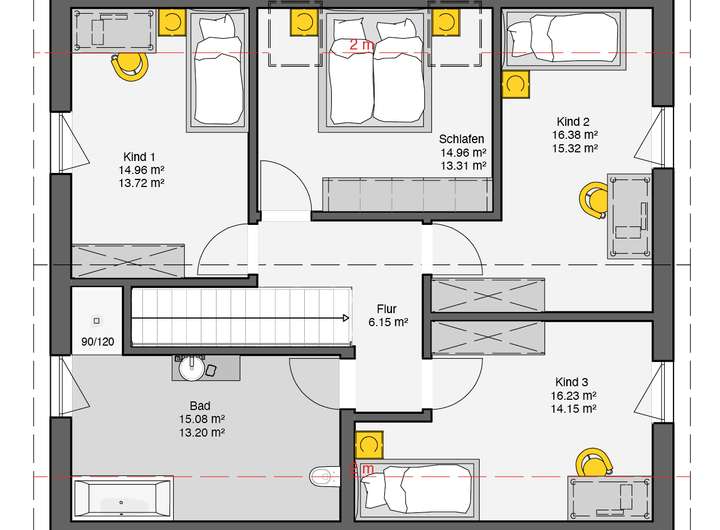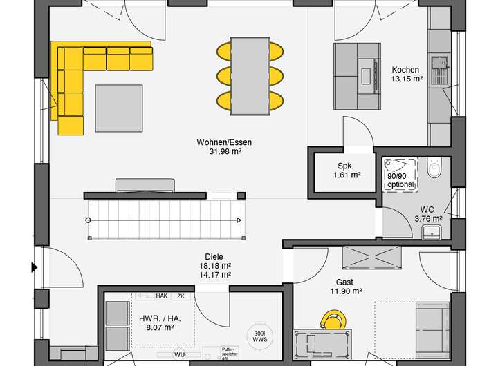 Bei diesem Grundriss ist der Aufgang ins Dachgeschoss separat. Die Treppe wird durch eine Wand vom offenen Wohn-und Essbereich abgetrennt.